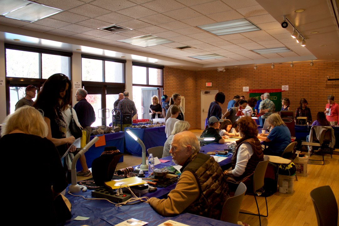 Per the usual, we welcomed back the Fluorescent Mineral Society, which is always an exciting display for newcomers and beginners in Geology- the brightly colored specimens are so amazing! We have also had the Gold Miners with us again- it would not be a show without them! Show guests were also able to learn about casting, soap stone carving, wire wrapping, Chinese Knotting, and more with demonstrators inside and outside on the patio.