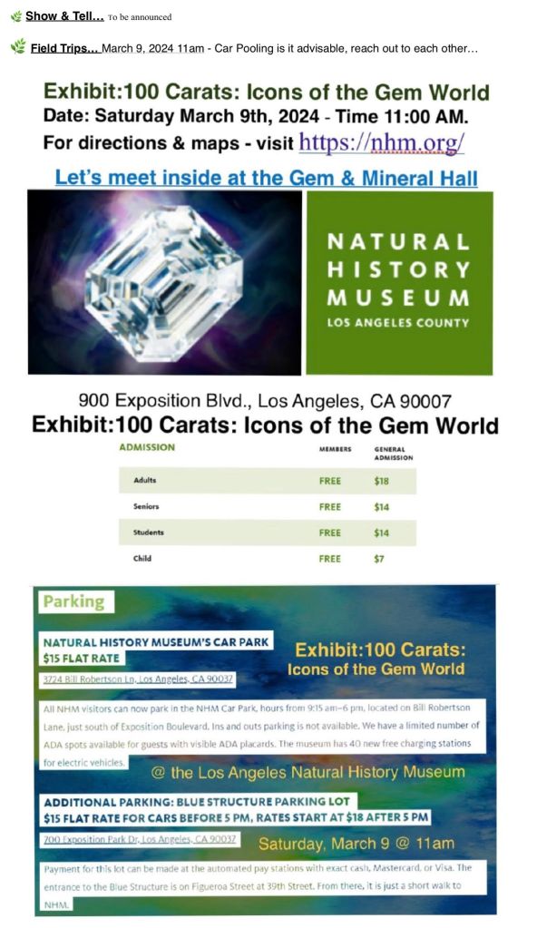 We will be having an upcoming field trip Saturday, March 9, 2024 at 11:00AM for the exhibit 100 Carats: Icons of the Gem World. We will be meeting inside the Gem & Mineral Hall.