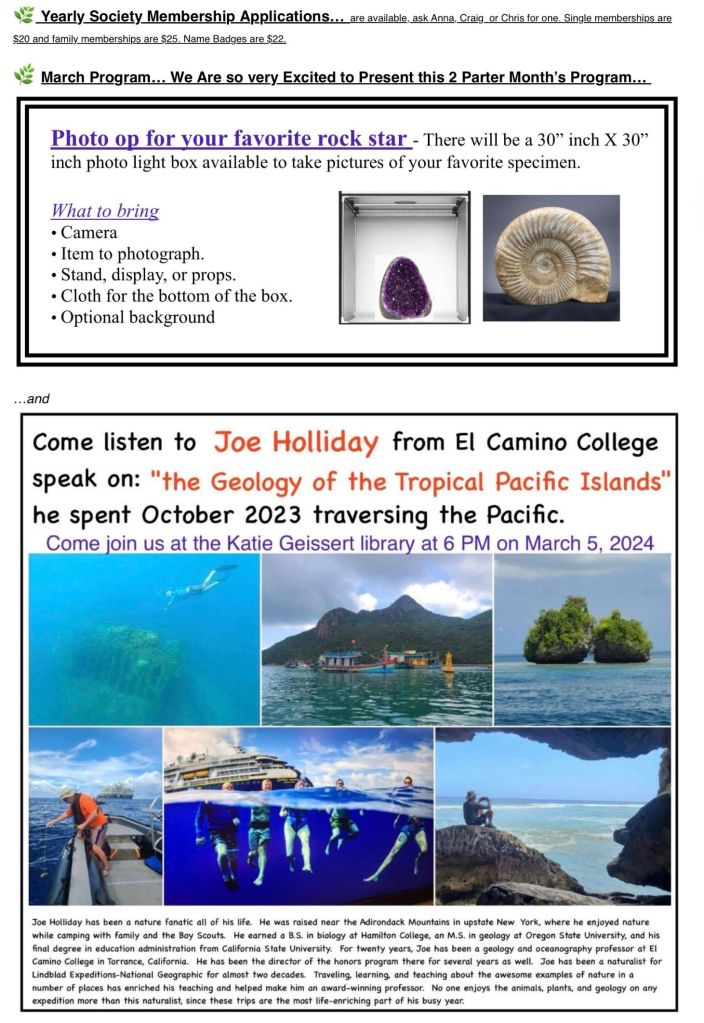 Upcoming meeting March 5, 2024 will feature Joe Holliday from El Camino College. He will be speaking on “the Geology of the Tropical Pacific Islands”. Joe has been a geology and oceanography professor at El Camino College. He has also been a naturalist for Lindblad Expeditions – National Geographic for almost 2 decades.